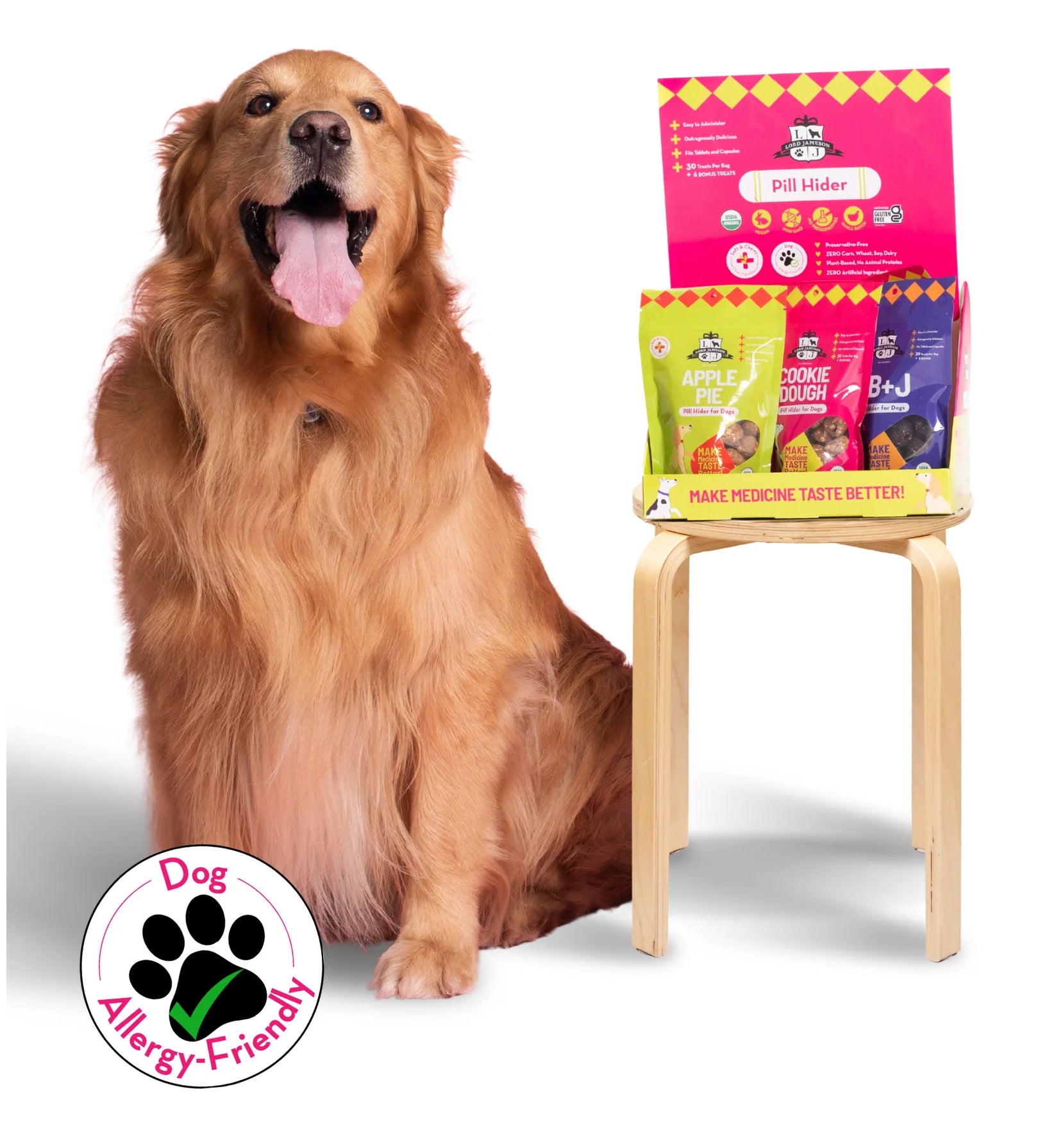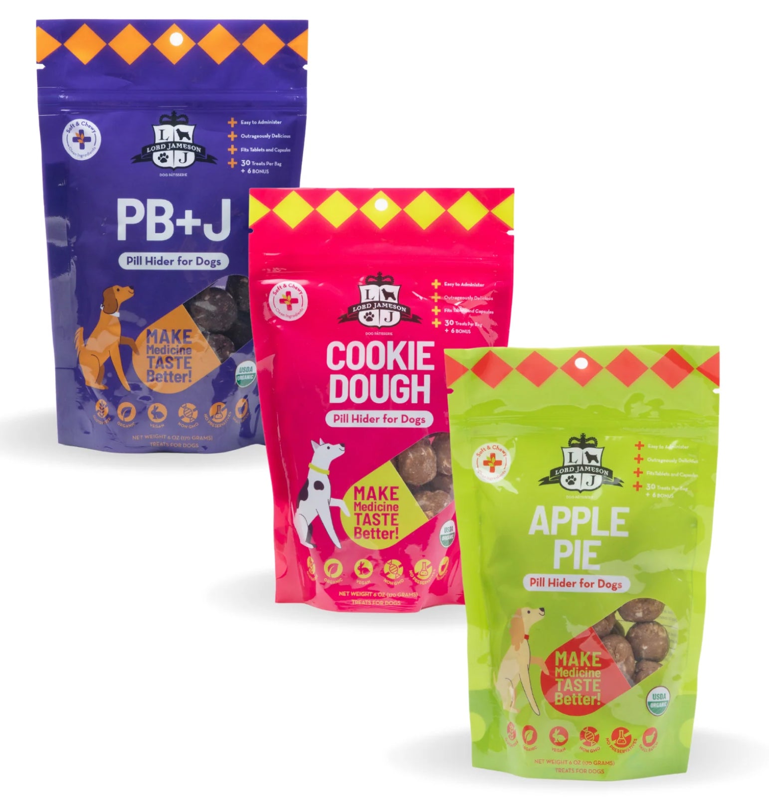 We’re thrilled to introduce 3 brand new, exciting flavors to the Lord Jameson offering : PB+J, Apple Pie, & Cookie Dough. Specifically chosen as their bold flavor profiles help mask the taste of your dog’s bitter medication.