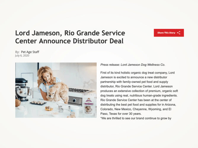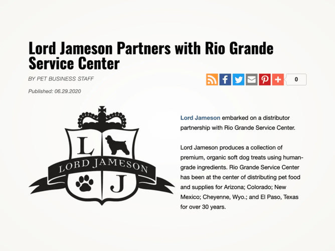 First of its kind holistic organic dog treat company, Lord Jameson is excited to announce a new distributor partnership with family-owned pet food and supply distributor, Rio Grande Service Center. Lord Jameson produces an extensive collection of premium, organic soft dog treats using real, nutritious human-grade ingredients.