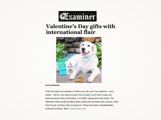 If like the regal Lord Jameson or Rerun my Lab, your true valentine – sorry hubby – has fur, four legs and says woof at night, you’ll want to get your beloved canine these small batch, non-GMO, preservative-free treats.