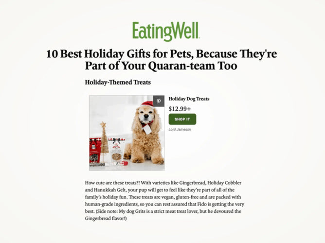 Whether your pup celebrates Christmas or Hanukkah, Lord Jameson’s got you covered. Choose from Holiday Cobbler (crisp green apples and oats), Gingerbread (peanut butter and oats), or Hanukkah Gelt (blueberries) — the entire collection is vegan, cruelty-free, plant-based, allergy-friendly, and made without any preservatives, artificial colors, flavors, or GMO ingredients.