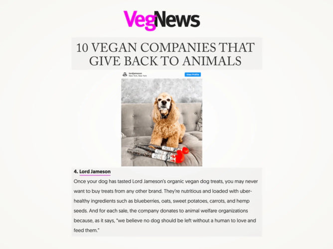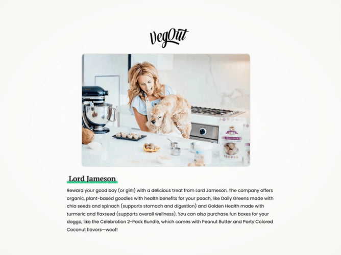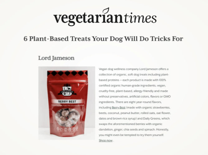 Vegan dog wellness company Lord Jameson offers a collection of organic, soft dog treats including plant-based proteins — each product is made with 100% certified organic human-grade ingredients, vegan, cruelty-free, plant-based, allergy-friendly and made without preservatives, artificial colors, flavors or GMO ingredients.