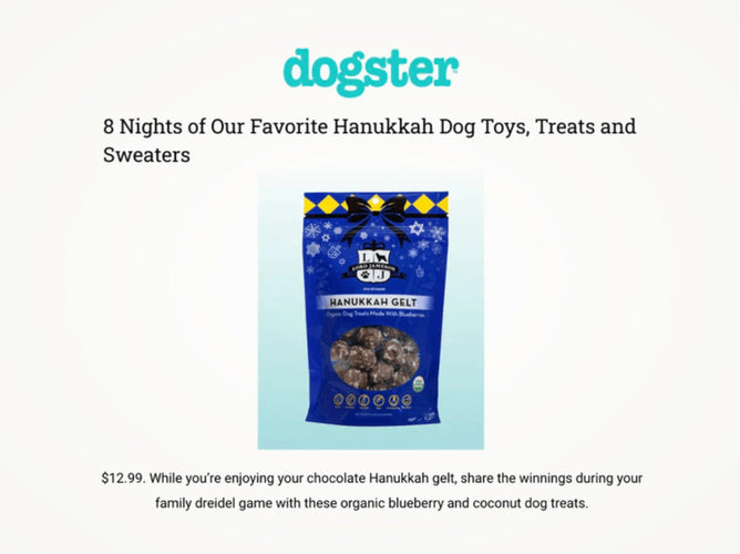 Hanukkah Gelt featured in Dogster Magazine's "8 Nights of Our Favorite Hanukkah Dog Toys, Treats and Sweaters"